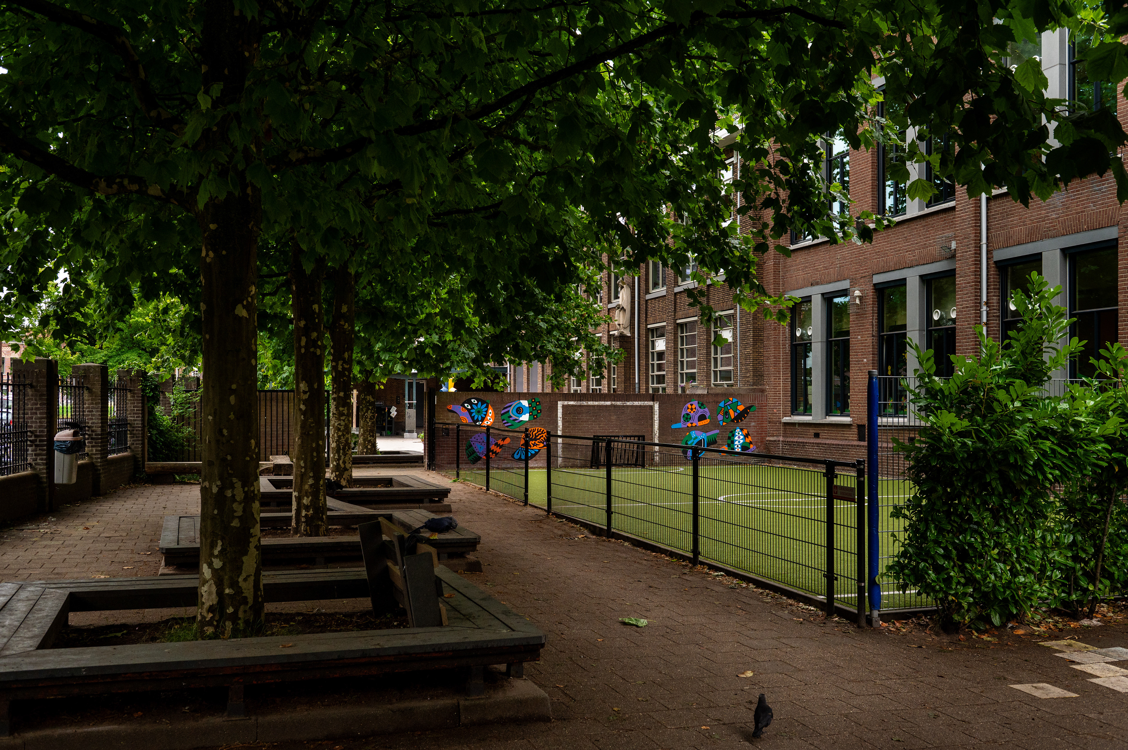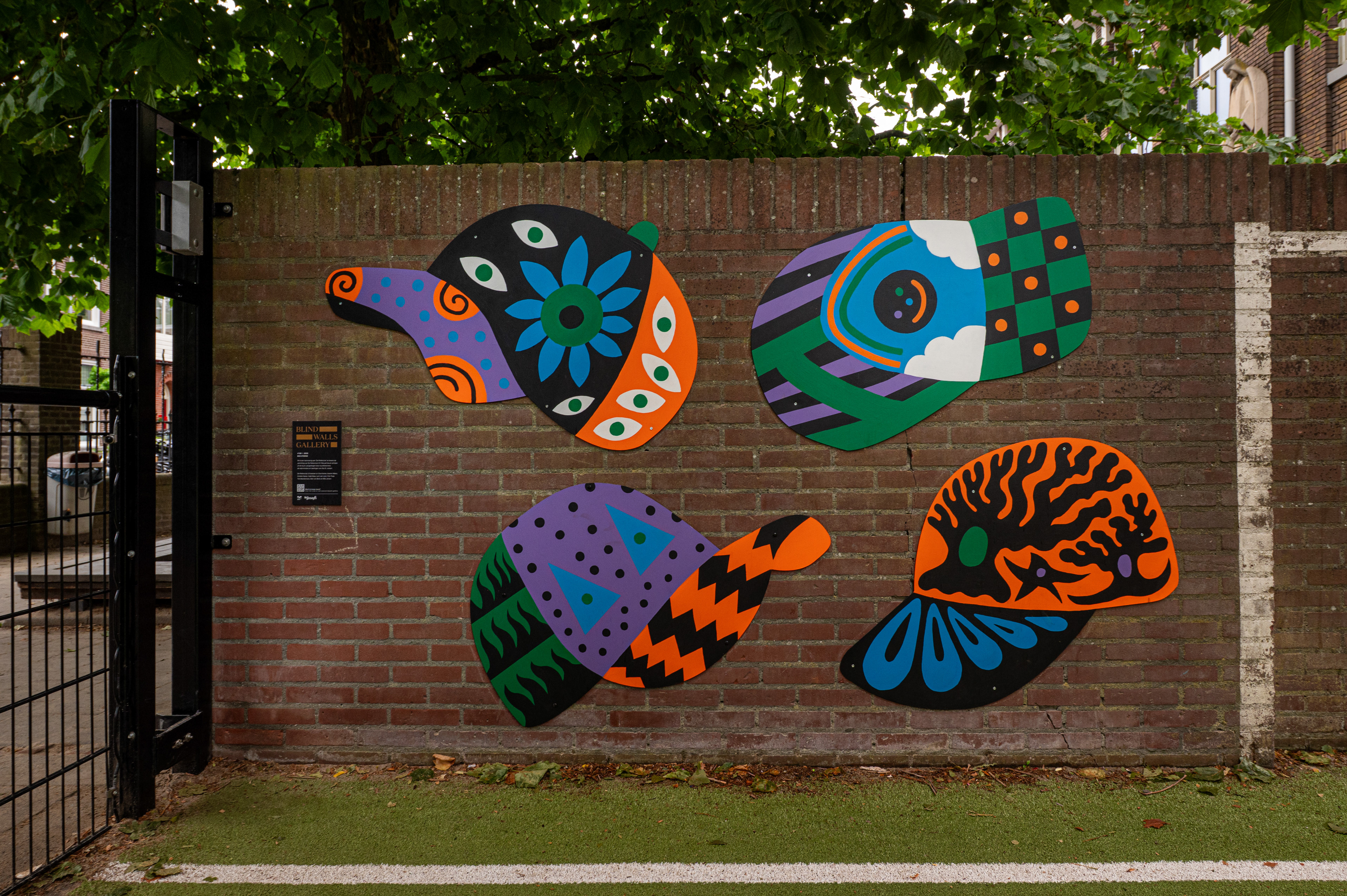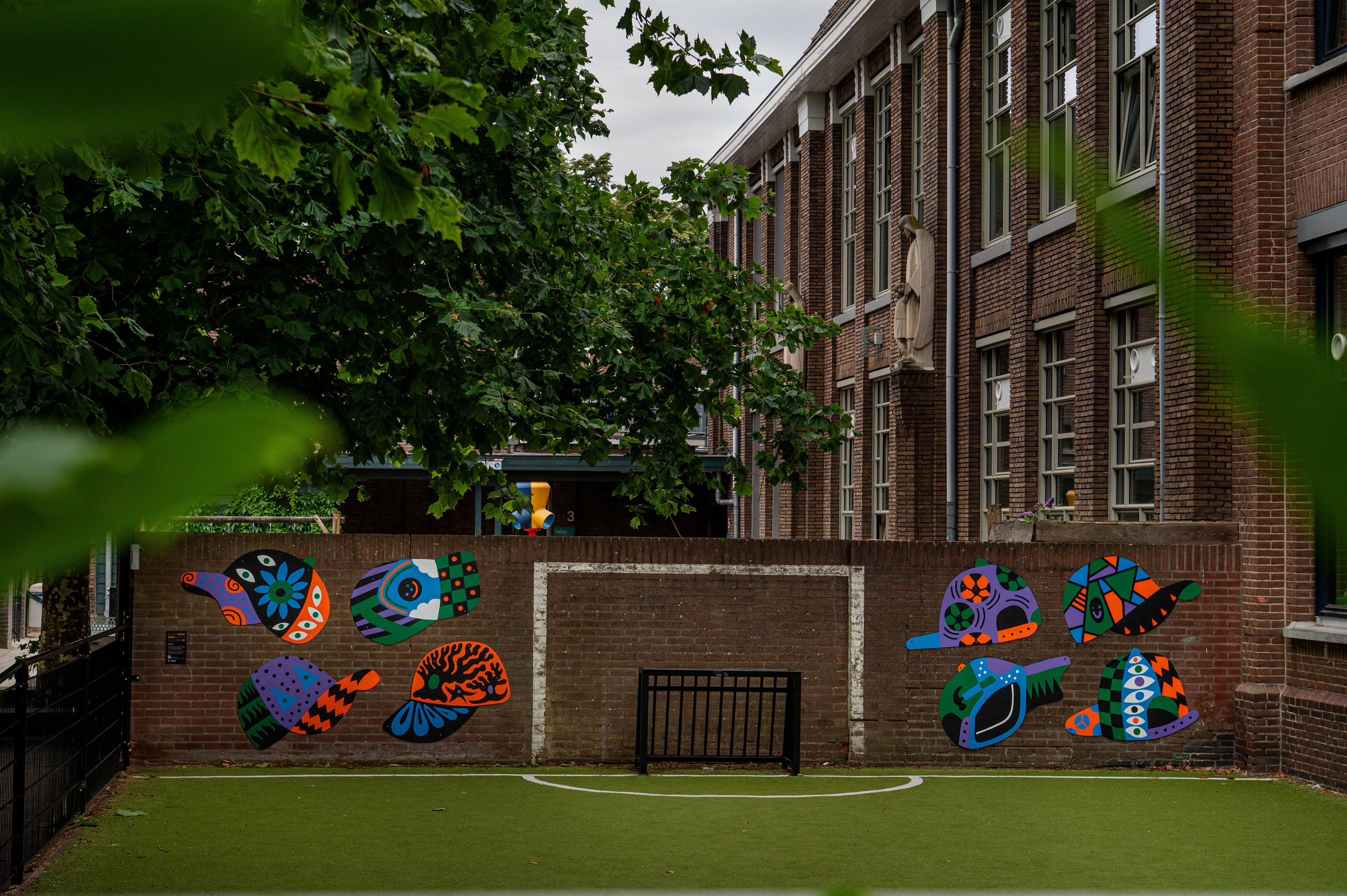 Students from Kbs St. Joseph, local residents, and neighborhood ministers collected personal stories from the area. These stories inspired a series of unique cap designs, based on the school’s “Kanjertraining” program, in which different caps symbolize various social behaviors and group dynamics. Nine students created their own painted caps, each connected to themes from the neighborhood such as traditional crafts, urban nature, football, and local culture. The designs were incorporated into a large mural installed behind the football field, bringing the legacy of the Pettenclub back to life in a modern, community-centered form.